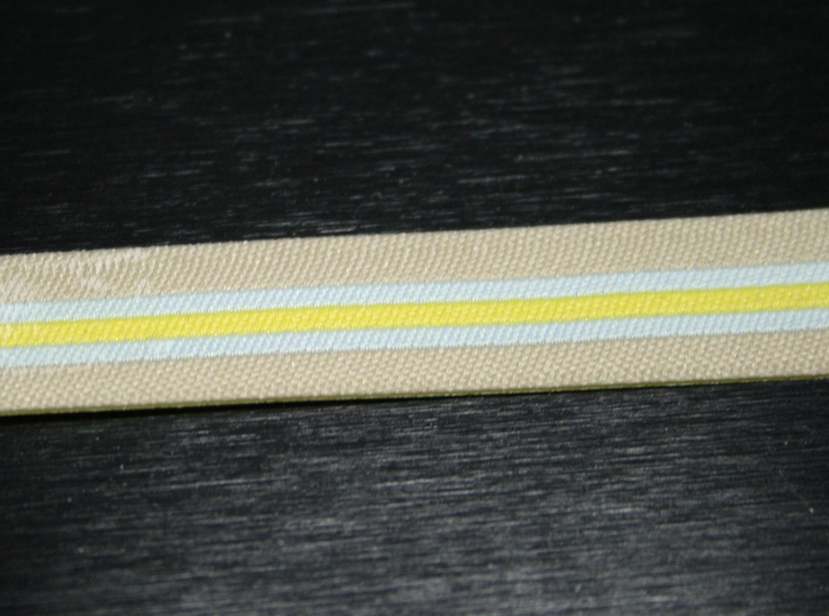 Band in beige- hellblau- gelb gestreift, die Breite ist 12mm, das Material ist Polyester.