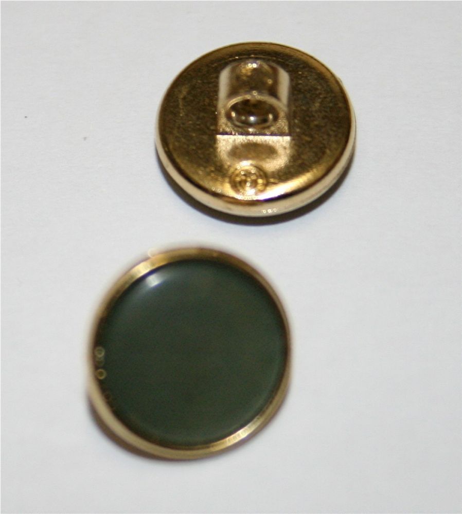 10 Stück Knöpfe aus Kunststoff in grünlich mit goldfarbener Umrandung und Öse an der Rückseite zum annähen, der Durchmesser ist 12mm.