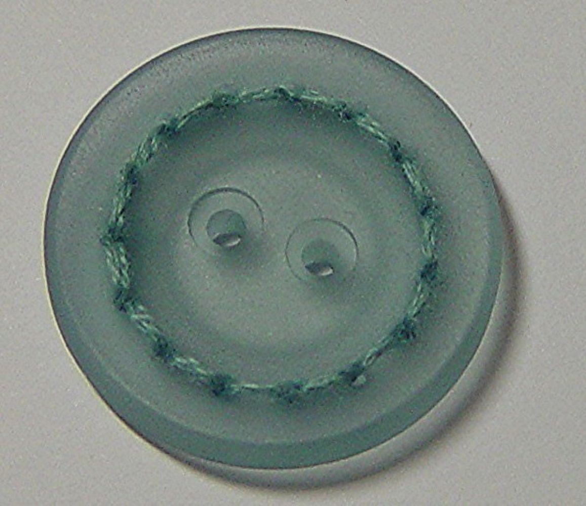 2-Lochknöpfe in hellblau, Kunststoff mit Fadenumrandung, der Durchmesser ist 15mm.