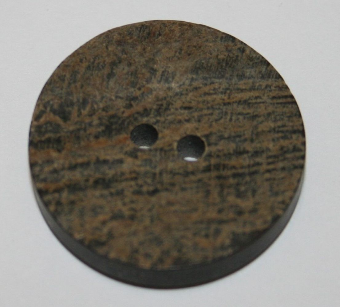 2-Lochknopf, holzähnlich, bräunlich, der Durchmesser ist 28mm.
