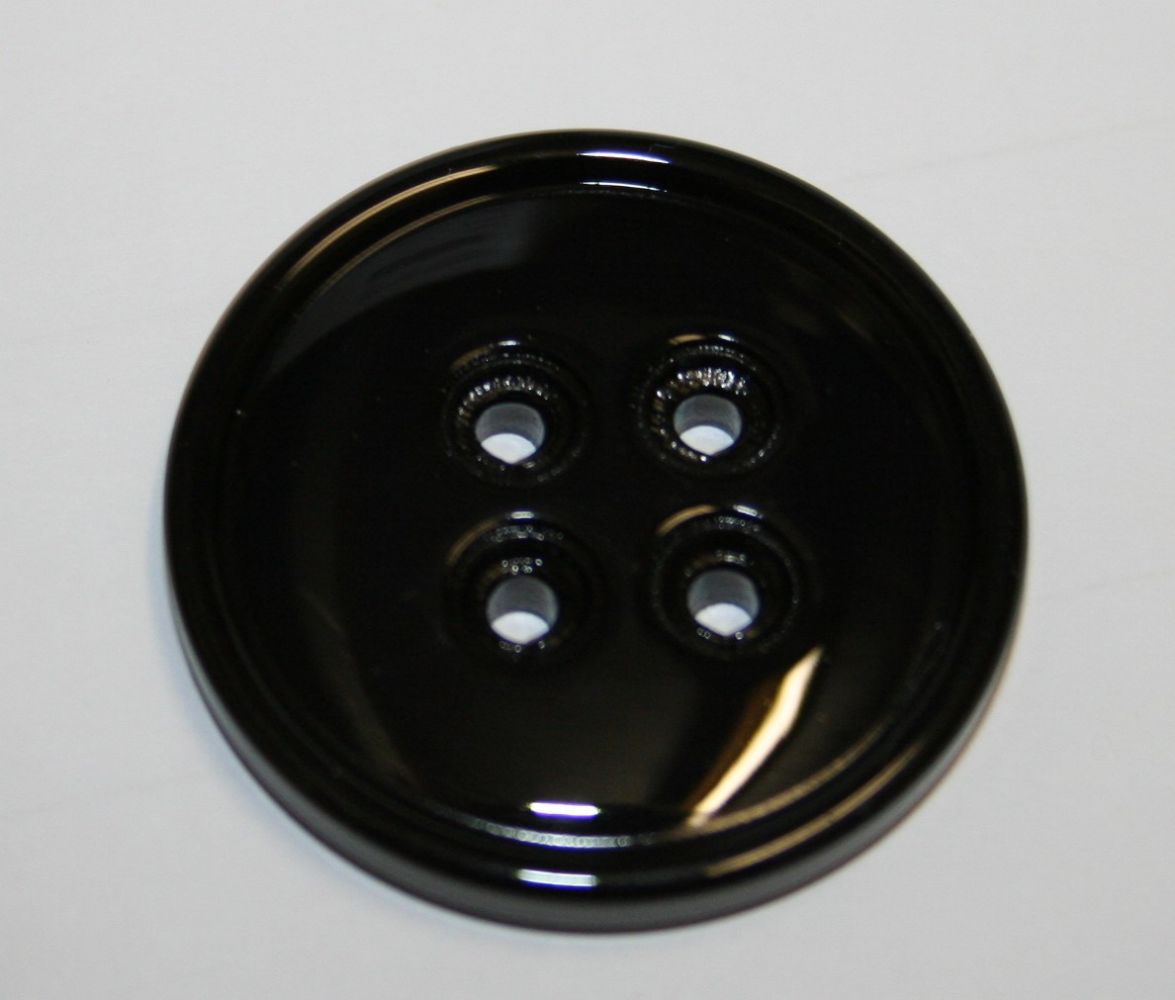4-Lochknopf in schwarz aus Kunststoff, glänzend, 34mm Durchmesser.