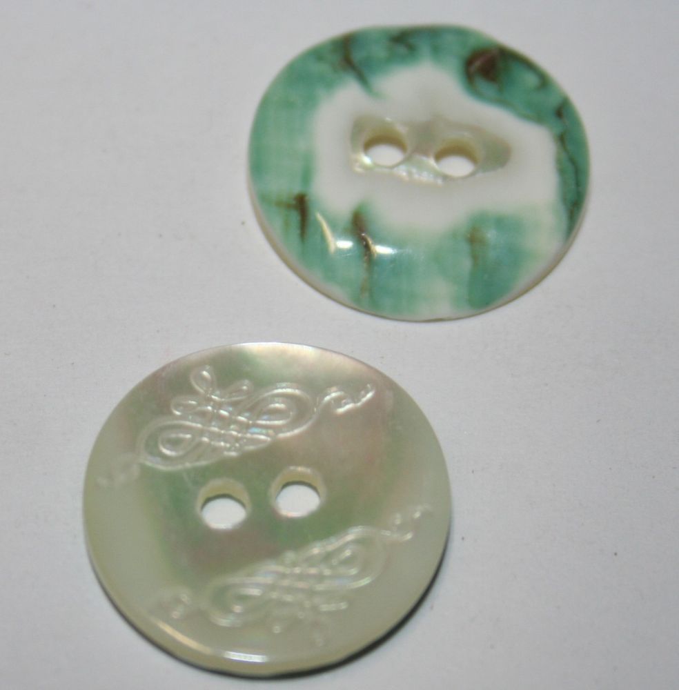 2-Lochknopf in hell aus Perlmut mit Muster, der Durchmesser ist 20mm.