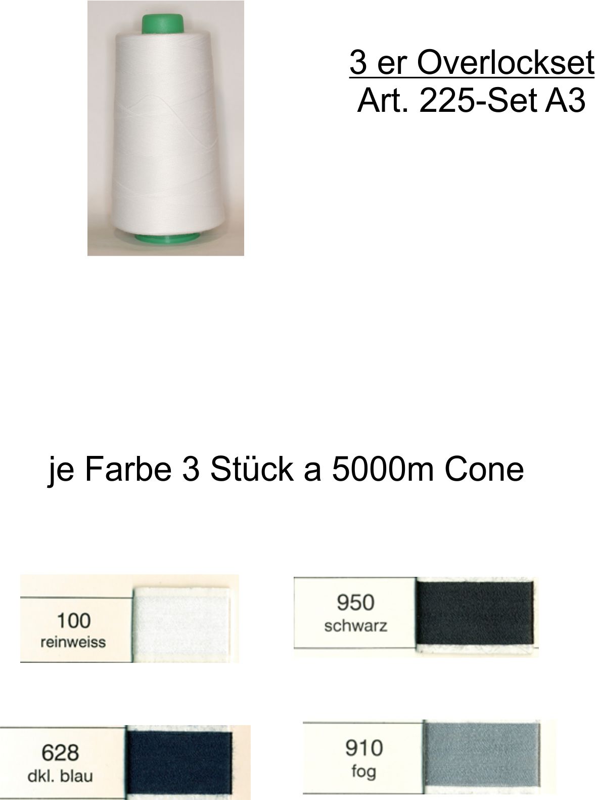 Farbaufteilung Farbe 100 weiß 3 Conen a 5000m Farbe 950 schwarz 3 Conen a 5000m Farbe 628 dunkelblau 3 Conen a 5000m Farbe 910 grau 3 Conen a 5000m