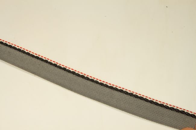 Paspolband in dunkel jeansfarben mit rotem Steppfaden, Gesamtbreite ist 13mm, davon zum annähen sind 8mm. Polyester