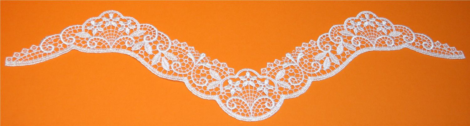 Spitzenstickerei (Formspitze) in weiß, die Größe ist 39cm breit X 10cm hoch.